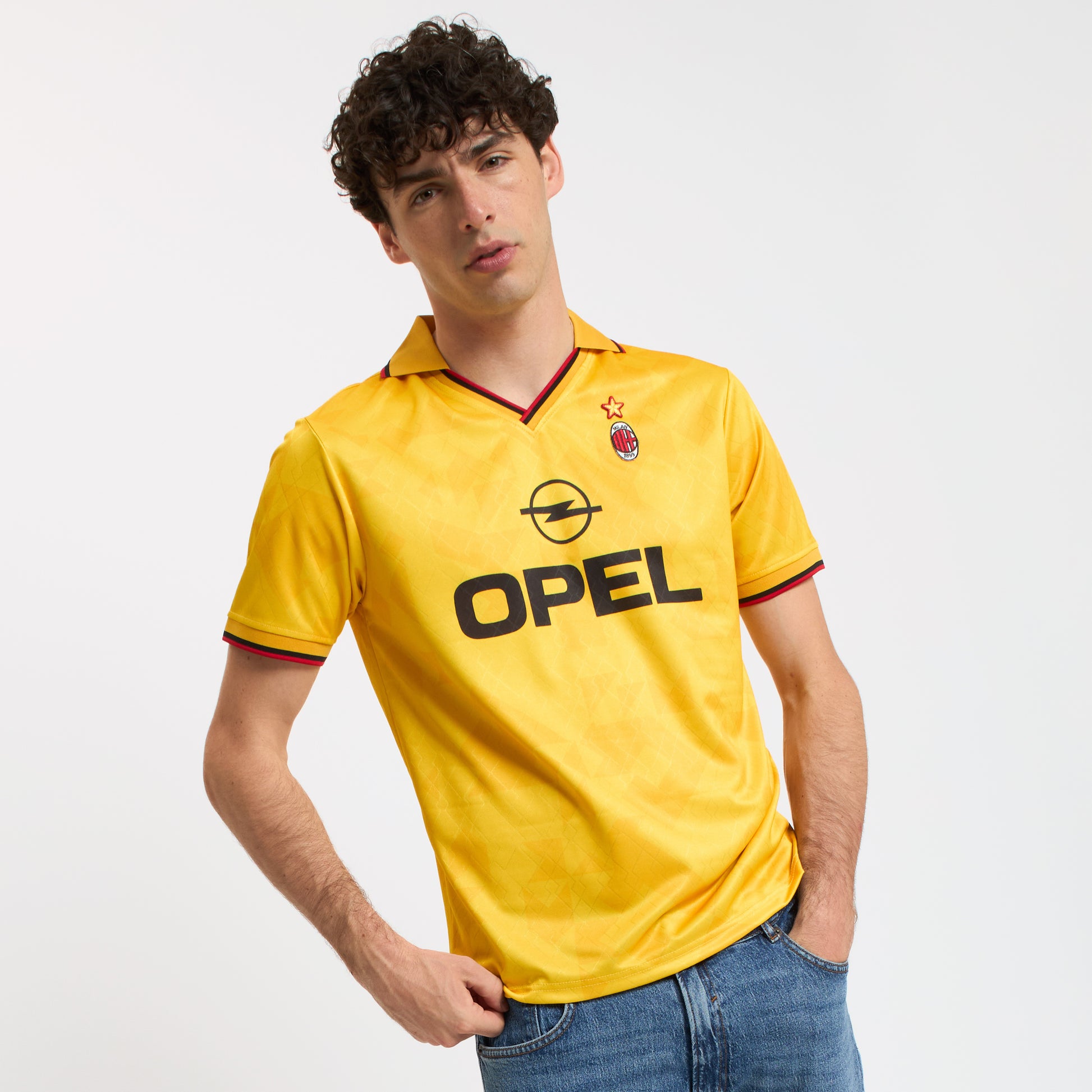 Innovative design, a true rarity from the mid 90s for the fourth jersey with the sponsor Opel on the chest. Worn by Demetrio Albertini and Dejan Savićević when they helped the team win the Serie A championship. The yellow color was used again on our third jersey after winning the 1995 UEFA Super Cup against Arsenal, with goals by Zvonimir Boban and Daniele Massaro.
