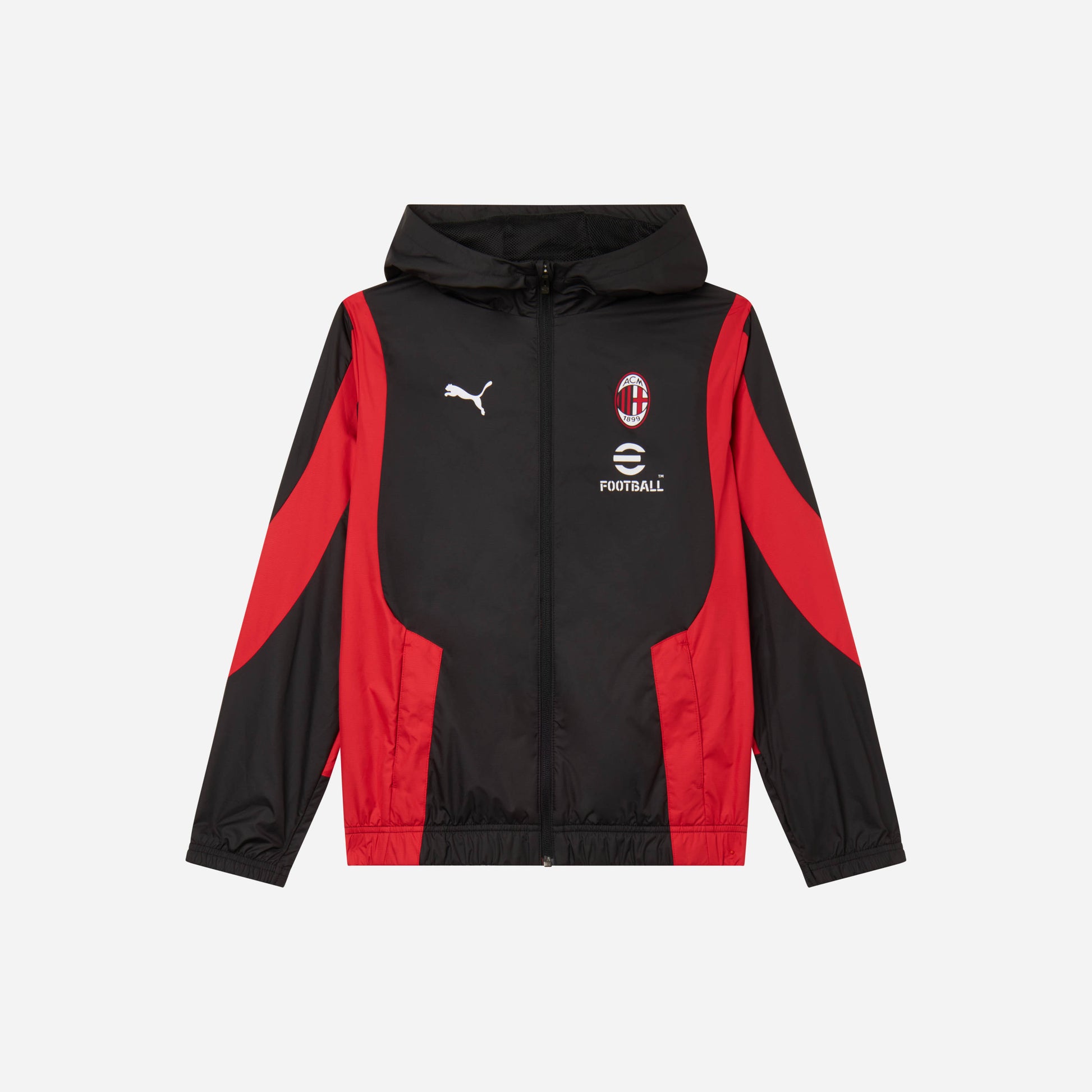 AC Milan jacket from the Prematch 2023/24 collection with a zippered opening and hood.