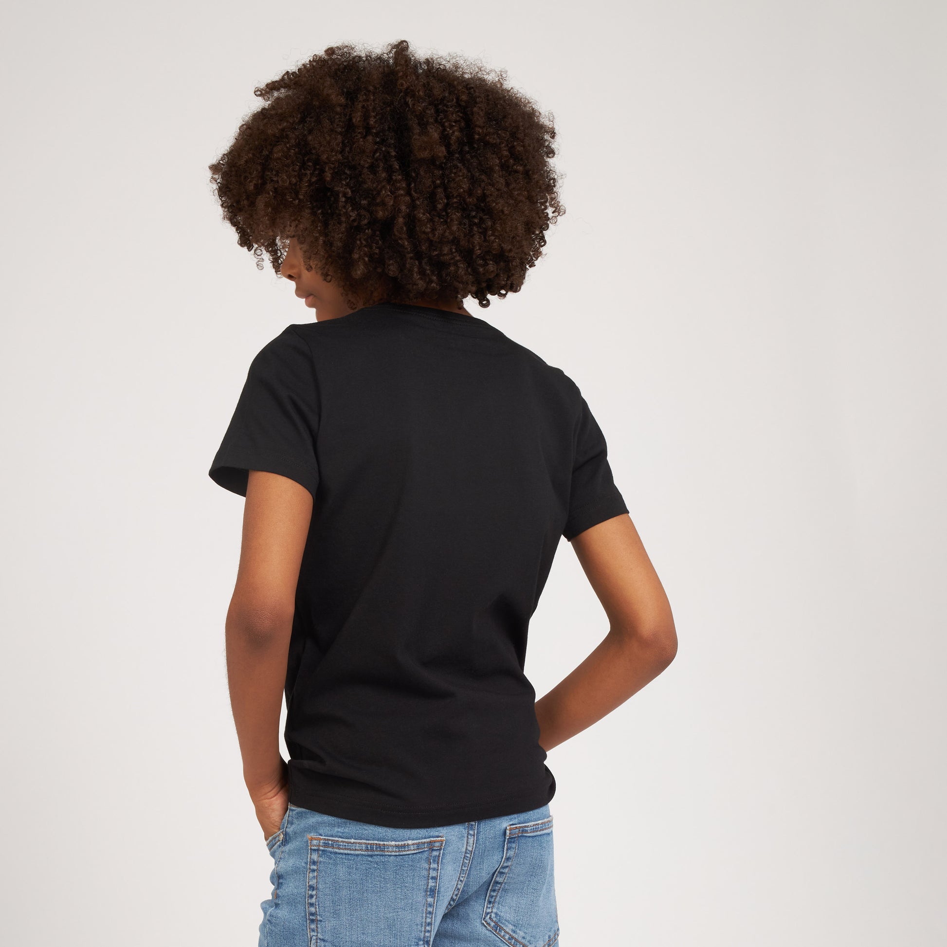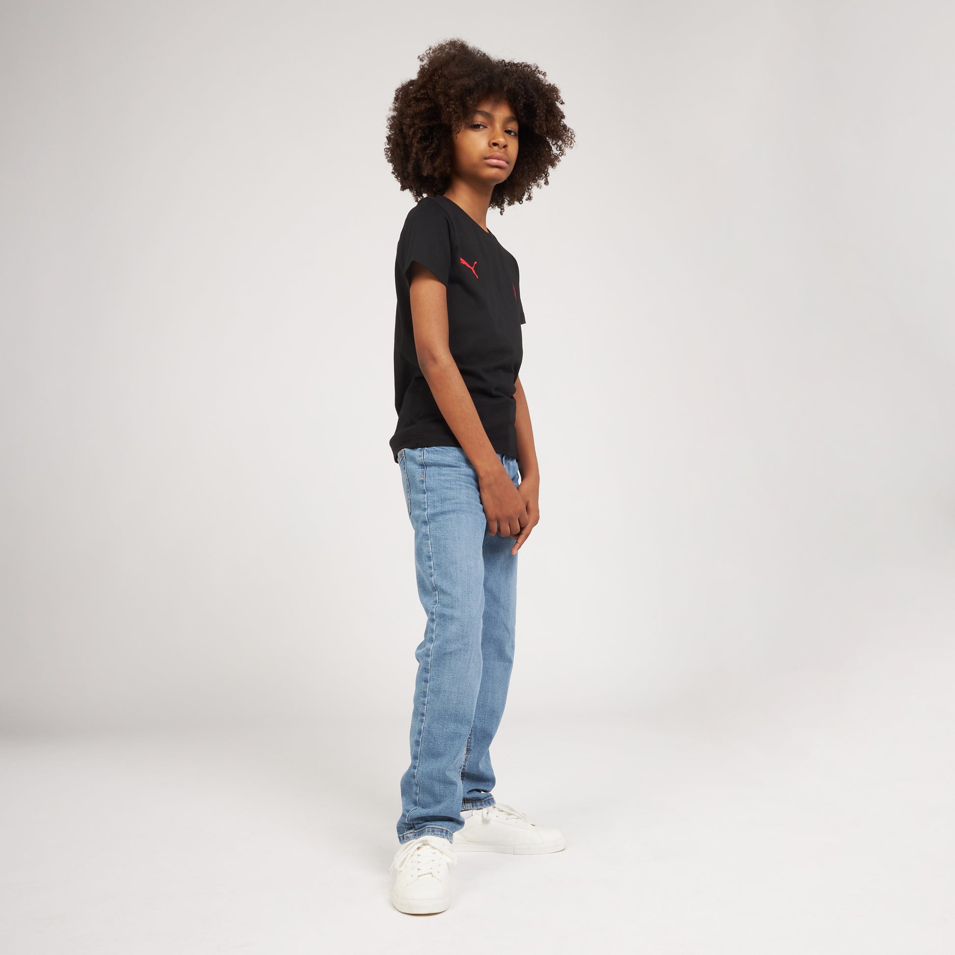 Esplora la collezione Essential: una t-shirt nera bambino a maniche corte con logo rosso.