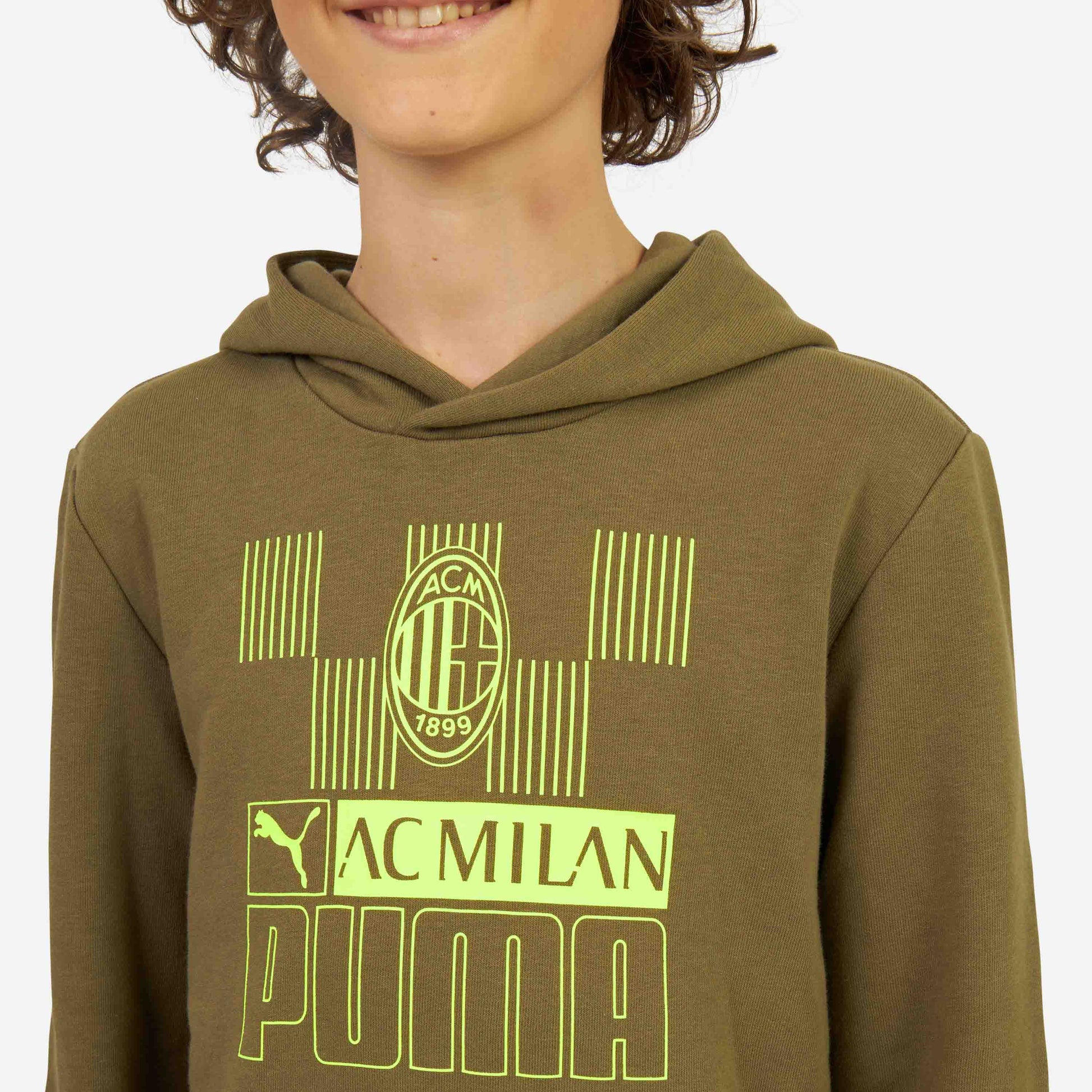 | Felpa AC Milan da bambino con cappuccio e stampa frontale della linea FtblCore. DETTAGLI . Grafica con logo ufficiale AC Milan e logo Puma stampata sul fronte . Manica lunga con polsino a costine . Tasca frontale . Fondo a costine . Vestibilità regolare . Il modello è alto xxx cm e indossa una taglia 11-12 anni MATERIALE E CURA . Materiale esterno: 70% cotone, 30% poliestere . Seguire sempre le istruzioni per la cura del capo riportate sull'etichetta interna |