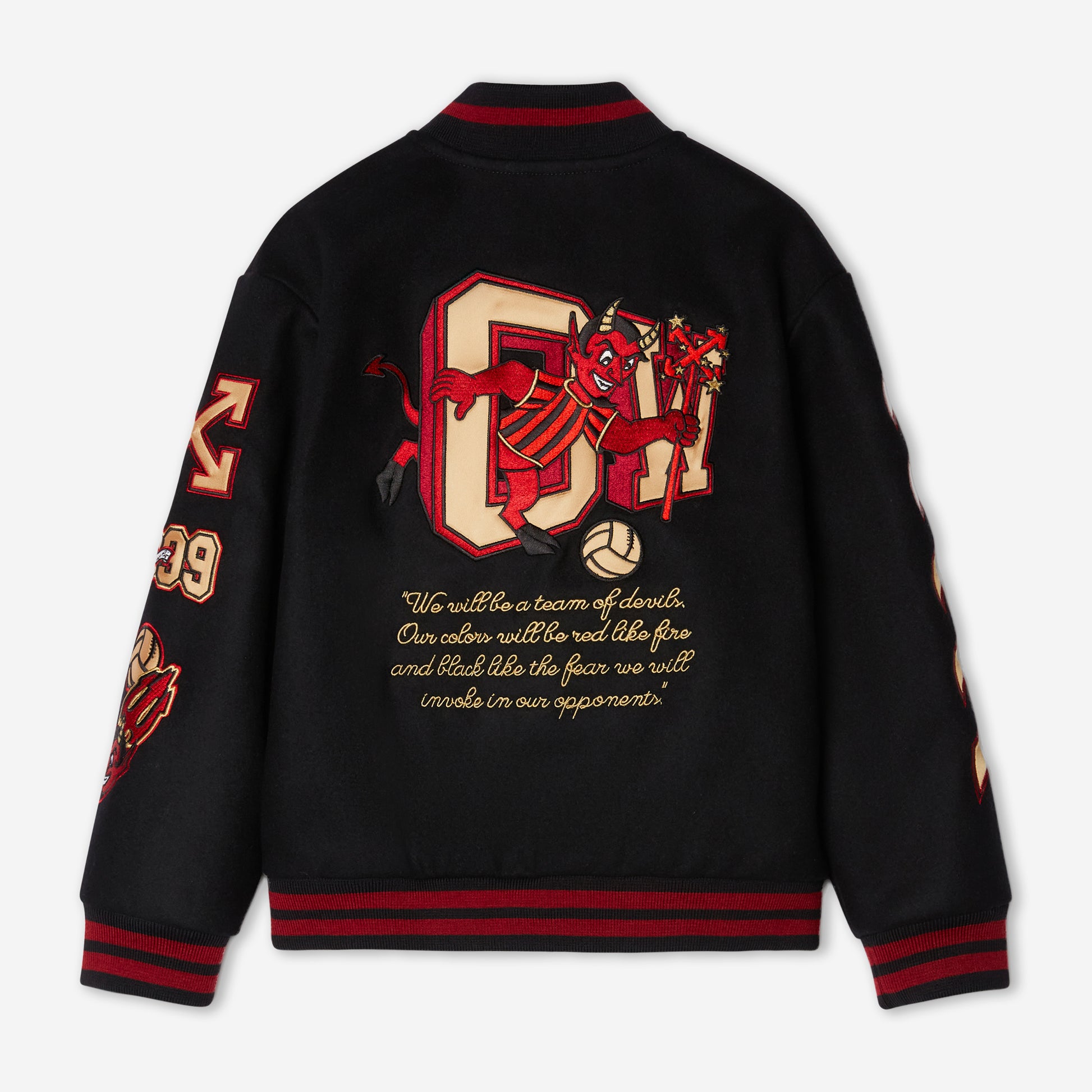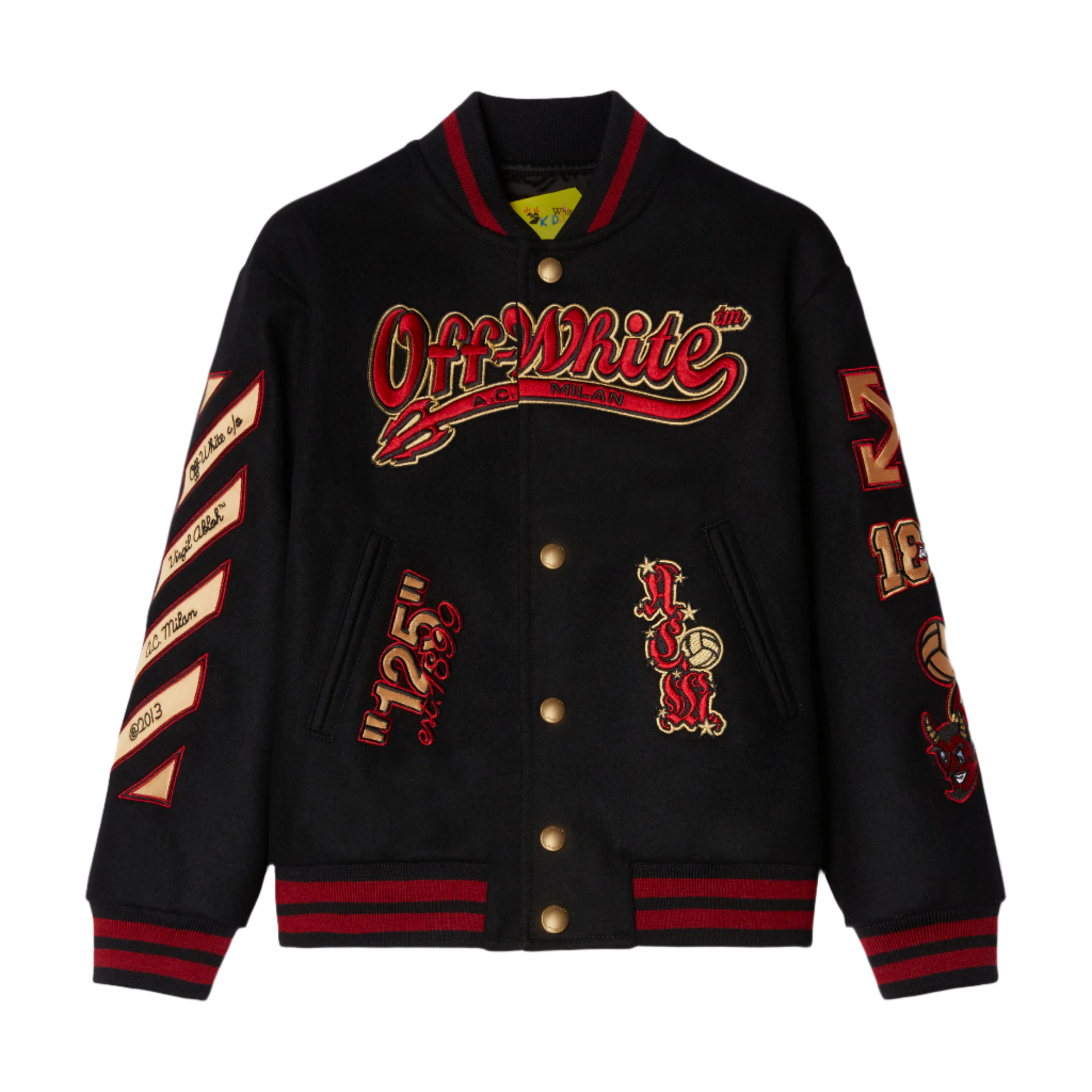 Radicata nella storia di AC Milan, la collezione combina alcuni dei simboli iconici del Club - il diavolo e i classici colori rosso e nero - con grafiche vintage calcistiche e il numero "125", insieme a dettagli dorati, per celebrare l'anniversario e la legacy dei rossoneri. Questi motivi compaiono sui capi di Off-White™ per adulti e bambini, tra cui una varsity jacket, felpe con cappuccio e t-shirt - oltre a una gamma di accessori, come cappellini da baseball, sciarpe da calcio, valigeria e calze. L'intera collezione è stata ideata e disegnata a Milano, città d'origine sia di AC Milan che di Off-White™, con la varsity jacket interamente Made in Italy - dalla produzione ai dettagli in raso dorato.