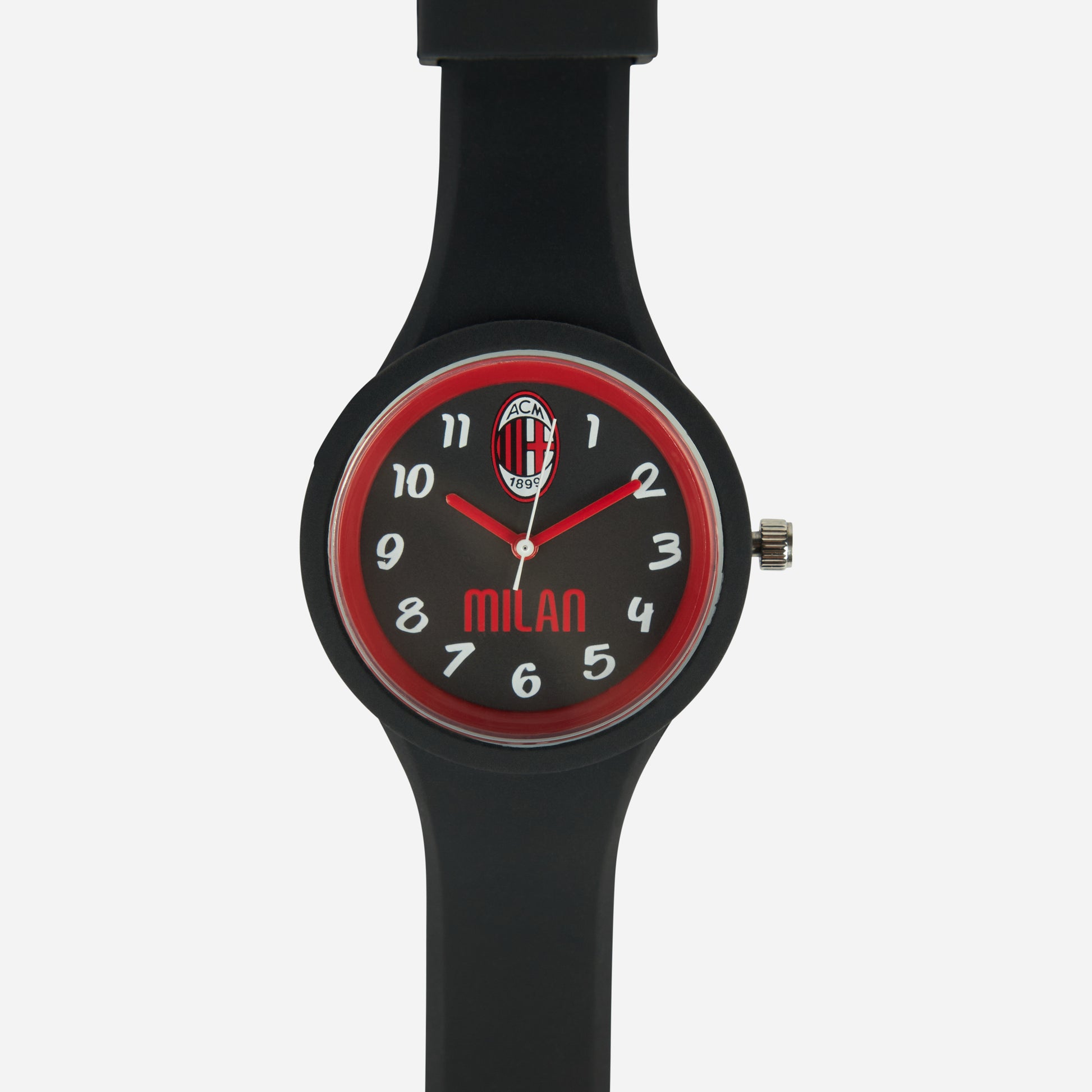 - Quadrante nero con scritta 'Milan' in rosso e logo ufficiale AC Milan