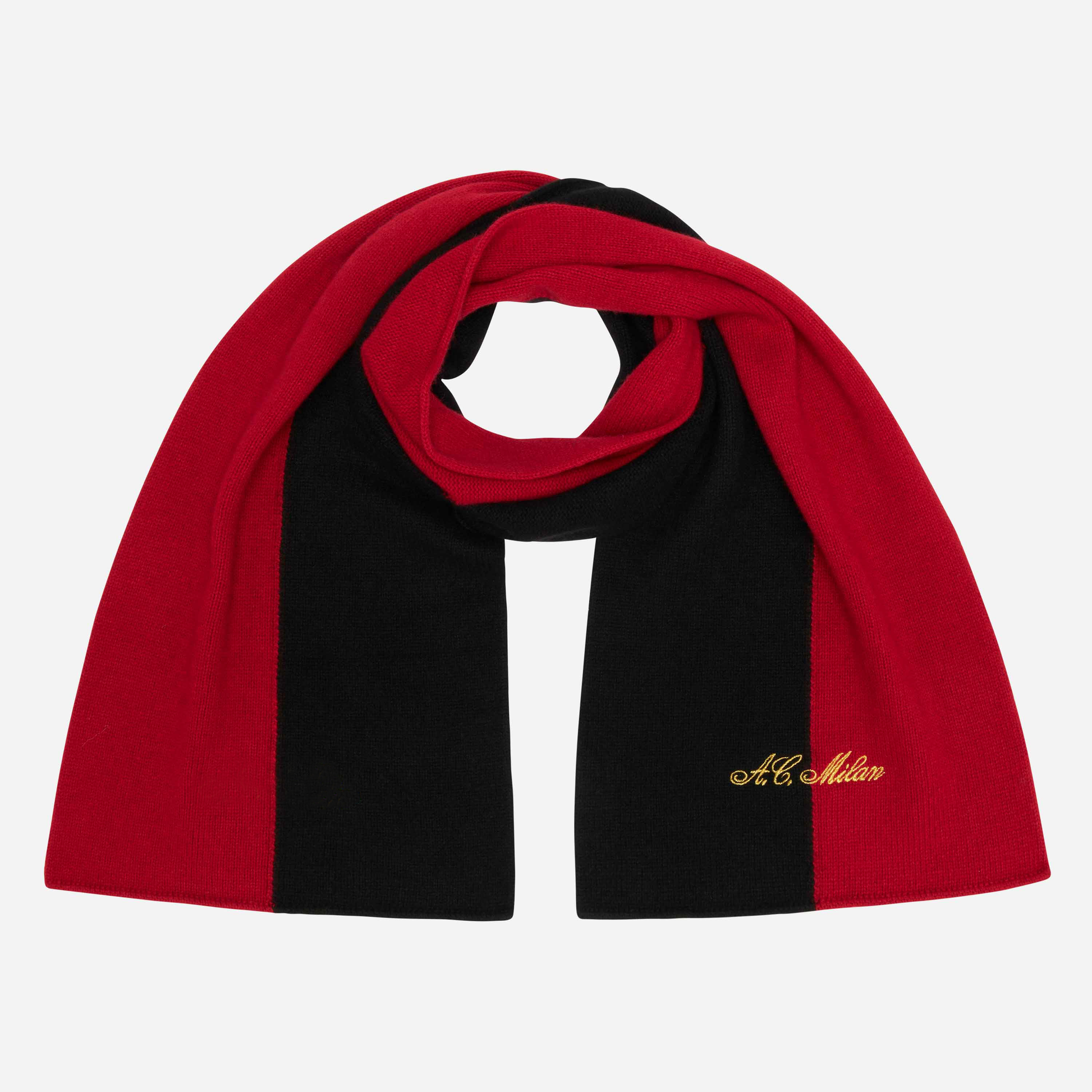 Sciarpa AC Milan rossonera in morbido misto cashmere, arricchita da ricami AC Milan in tonalità oro.